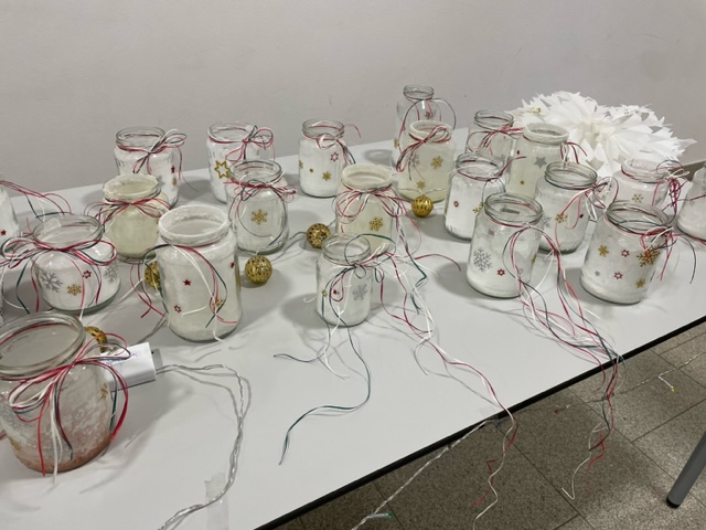 Zwischendrin stärkten sich alle am reichhaltigen Büffet des Elternbeirats. Angeboten waren Kartoffelsuppe von unserer OGS – Mittagsköchin, Wienersemmeln, Glühwein und Backwaren. Draußen waren Stehtische mit heimeliger Beleuchtung aufgestellt. Bei Weihnachtsmusik fühlte man sich wie auf einem „echten“ Christkindlmarkt.