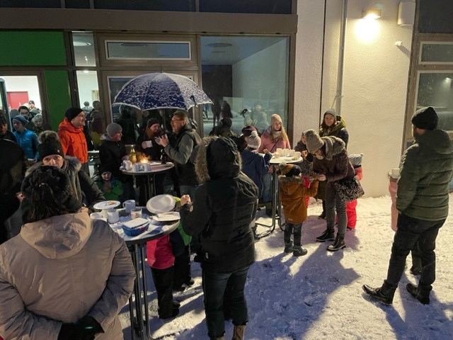 Am Freitag, den 17. Dezember 2022 traf sich die Schulfamilie der Grundschule am Regen auf dem Schulhof. Wildes Schneegestöber sorgte für eine vorweihnachtliche Atmosphäre. Rektorin Ulrike Nauen begrüßte Kinder und Angehörige, die Bürgermeister und Schulverbandsmitglieder und viele ehemalige Kollegen.