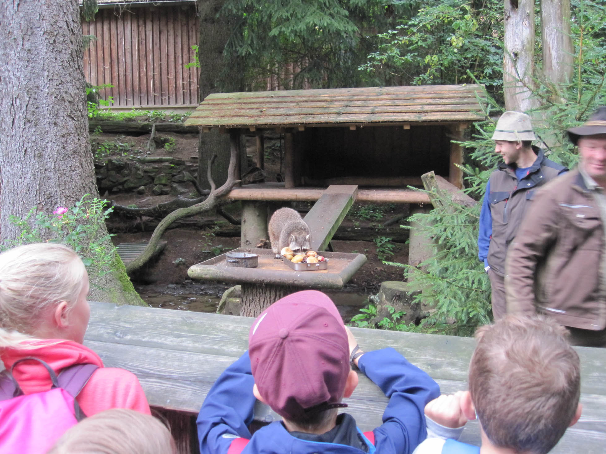 Im Rahmen der Wanderwoche besuchten die beiden 1. Klassen der Grundschule Miltach am 25. Juni sowie die beiden 3. Klassen am 28. Juni den Bayerwald-Tierpark in Lohberg. Bei einer Führung durch den Tierpark machten die Schülerinnen und Schüler gemeinsam mit ihren Lehrkräften bei vielen interessanten Tieren halt. Bei den Elchen erfuhren sie, dass diese Tierart nur selten in Zoos zu sehen ist, weil diese Wiederkäuer eine große Menge an Grünpflanzen fressen. Beim Gehege der Eule wollte die Führerin von den Grundschülern wissen, wieso es für die Eule wichtig ist, dass sie ihren Kopf weit nach allen Seiten drehen kann. Nachdem die Kinder die Eule eine Zeitlang beobachtet hatten, konnten sie diese Frage leicht beantworten. Diese Tierart kann ihren Augen nicht wie wir Menschen nach links und rechts bewegen, dazu muss die Eule ihren Kopf drehen. Bei den Rentieren konnten die Kinder das mächtige Geweih von Rudolf bewundern. Auch im Wolfgehege war viel los. Das Wolfsrudel, das aus bis zu 15 Tieren bestehen kann, hatte erst vor kurzem Nachwuchs bekommen. Die Führerin erklärte, dass Wölfe eigentlich sehr scheue Tiere sind, die sich vor den Menschen verstecken. Nach dieser interessanten Führung und einer Pause auf dem Spielplatz, fütterten die Schülerinnen und Schüler noch die Ziegen, bevor es wieder zurück nach Miltach ging.