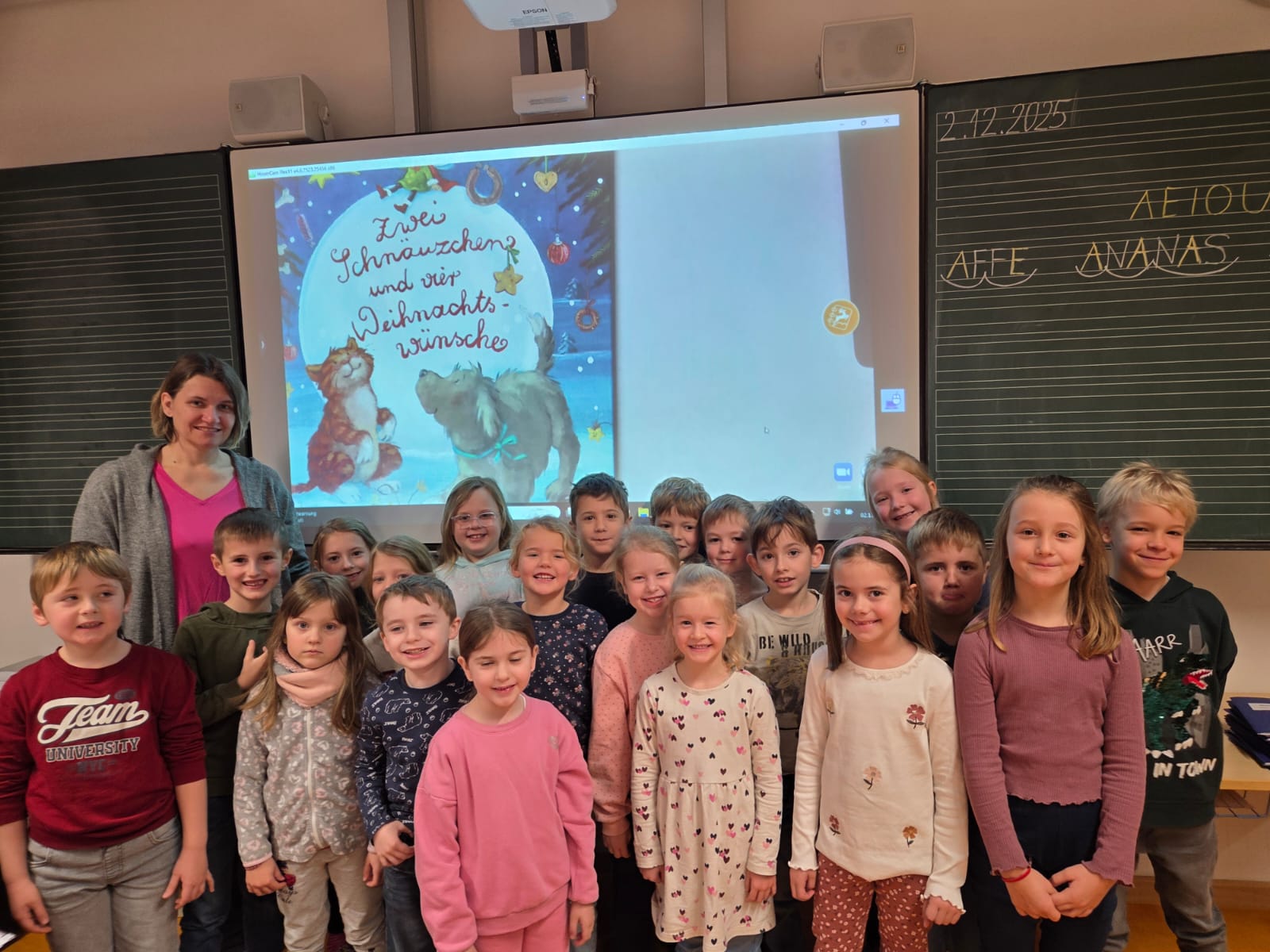 Aus dem Buch zwei „Schnäuzchen und vier Weihnachtswünsche“ las eine Erzieherin des Kindergartens Miltach den Schülerinnen und Schülern der Klasse 1b vor.