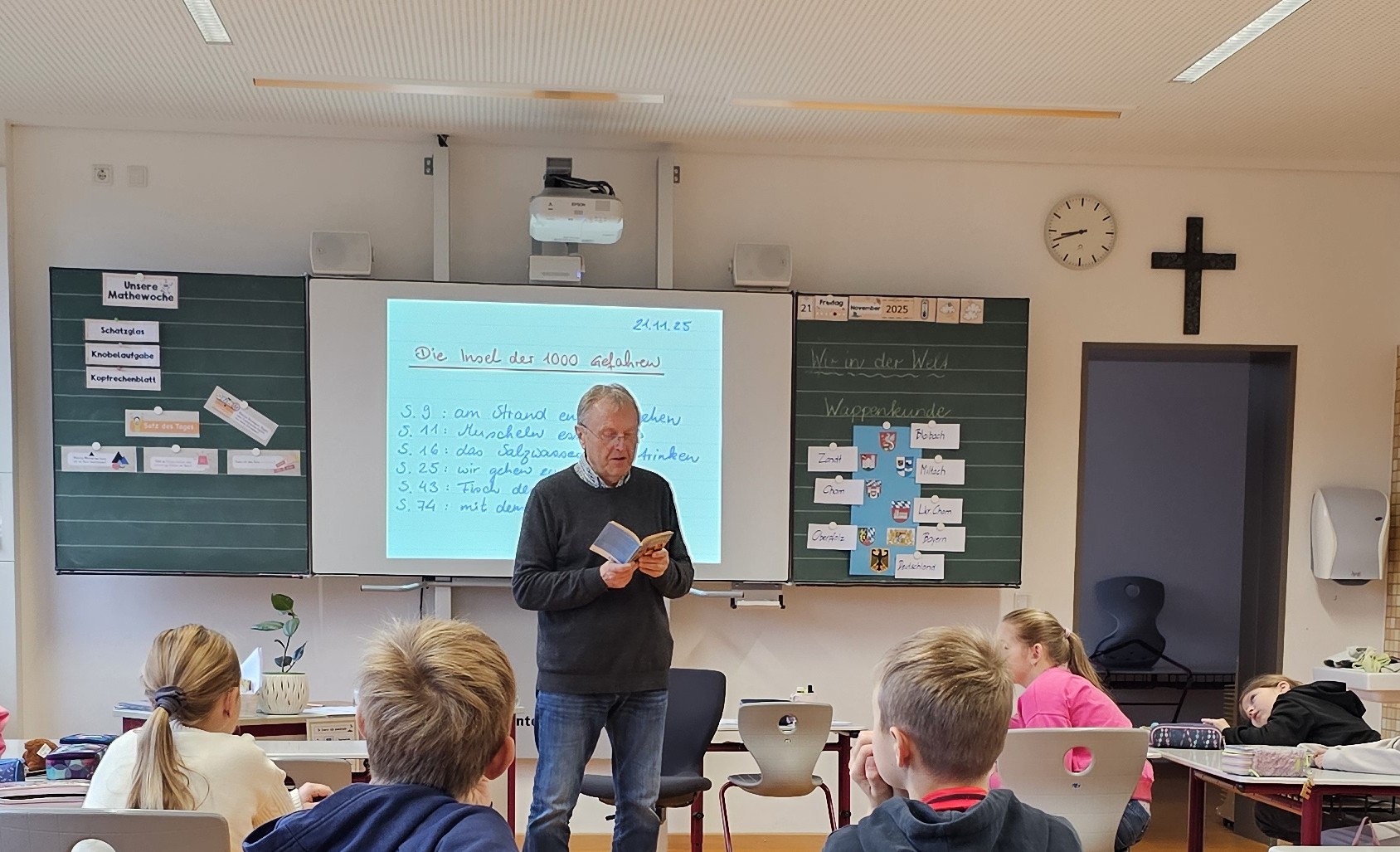Frau Hauser hatte am 21. November einen ganz besonderen Vorleser dabei. Ihr Vater und ehemaliger Schulamtsdirektor des Landkreises Cham Karl Utz besuchte die Schülerinnen und Schüler der Klasse 4a und las ihnen aus dem Buch „Die Insel der 1000 Gefahren“ vor.