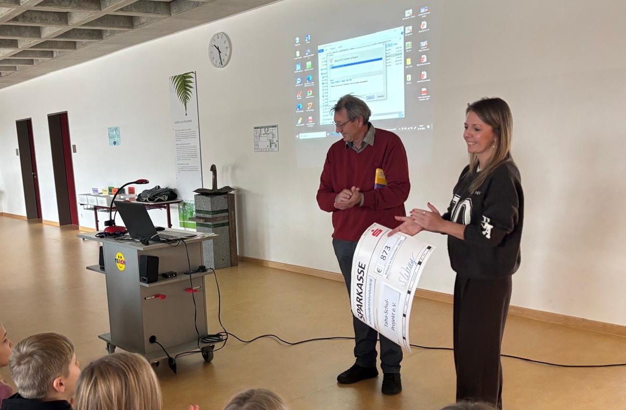Hier boten sie gut erhaltene Spielsachen und Bücher an. Dabei haben die Viertklässler 863 € eingenommen. Diese wurden nun einem guten Zweck gespendet, dem Taha-Schul-Projekt. Am Dienstag vor den Weihnachtsferien konnte der Scheck schließlich überreicht werden. Der Kassier des Vereins, Herr Wenzl, zeigte den Kindern in einem spannenden Vortrag, wie das Projekt zu Stande kam. Aktuell gibt es nur eine Art Grundschule in Taha. Um eine weiterführende Schule zu besuchen, müssen die Kinder einen weiten Schulweg auf sich nehmen. Ziel des Vereins ist es, eine weiterführende Schule zu etablieren. Vom Spendenerlös wird voraussichtlich ein neuer Beamer und neues Schulmaterial angeschafft. Auch stellte er ihnen das Land Ghana, die Menschen dort, die Natur und die Sprache etwas genauer vor.